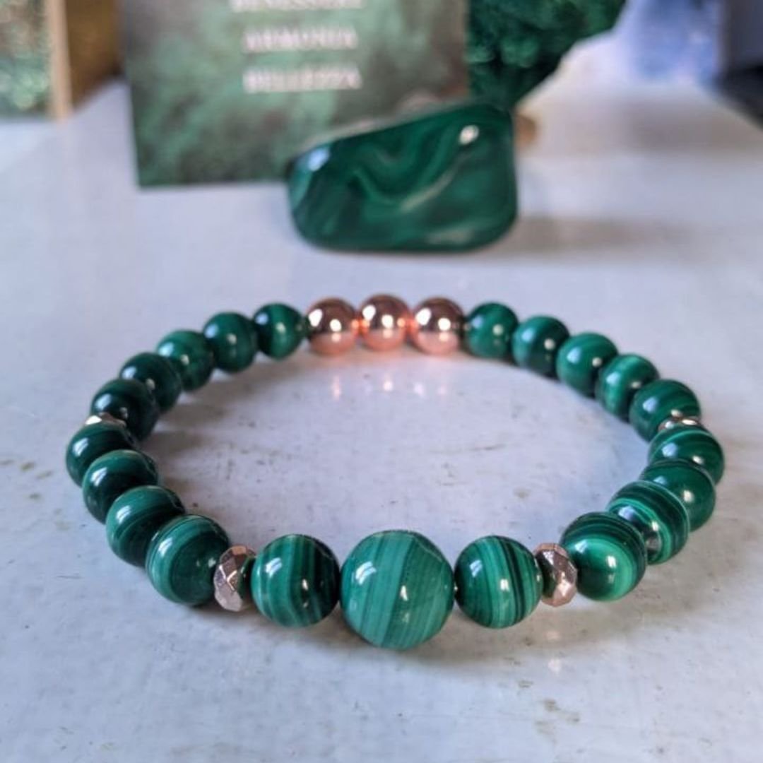Perla centrale di Malachte 10mm – Perle malachite 8mm – 3 Perle di puro Rame 8mm