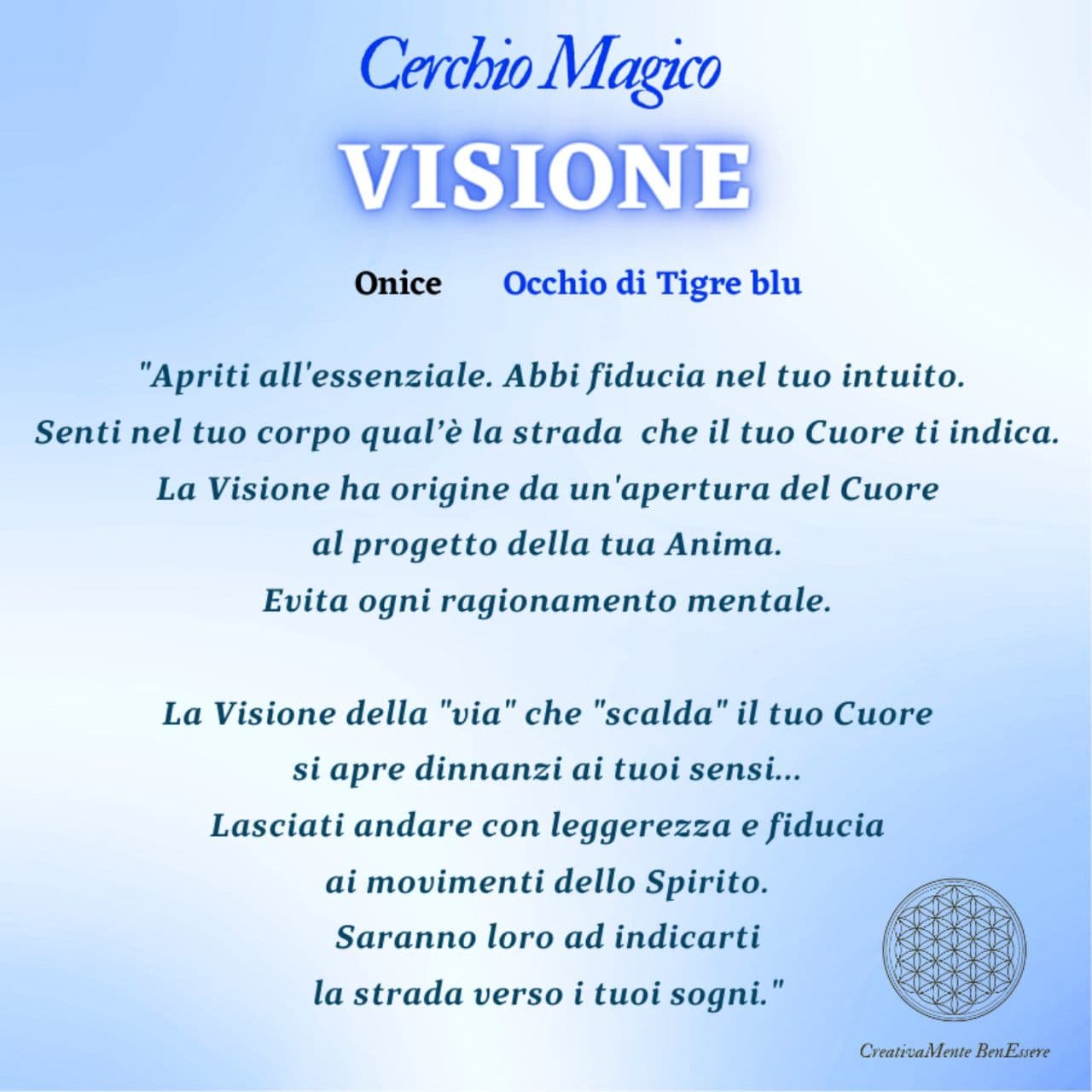 Ho recentemente avuto il piacere di ricevere dei bracciali creati da Fabrizio e Laura, e devo dire che sono molto più di semplici bracciali. Il bracciale “Visione,” realizzato con onice e occhio di tigre blu, è senza dubbio il mio preferito. Questo bracciale non è solo esteticamente splendido, ma emana un’energia particolare che alimenta la fiducia nel proprio intuito, aprendo il cuore alla realizzazione del proprio percorso animico. Indossarlo è stato come essere avvolta da un’ondata di consapevolezza, un richiamo profondo a fidarmi di me stessa e del mio cammino. Quando indosso il cerchio “Visione” insieme agli altri due, “Armonia” e “Tranquillità e Antistress,” sento come se si creasse una potente sinergia, capace di infondere l’energia benefica delle pietre in modo intenso e armonioso. Oltre alla bellezza e al significato profondo di ciascun bracciale, ho apprezzato moltissimo la cura con cui sono stati presentati. I bracciali, chiamati giustamente cerchi magici, mi sono arrivati in una deliziosa scatoletta con inciso il Fiore della Vita, un simbolo geometrico sacro che rappresenta i giorni della creazione. Ogni bracciale è stato ben imballato, e ogni scatola contiene una spiegazione dettagliata delle pietre utilizzate, aggiungendo un ulteriore livello di significato.